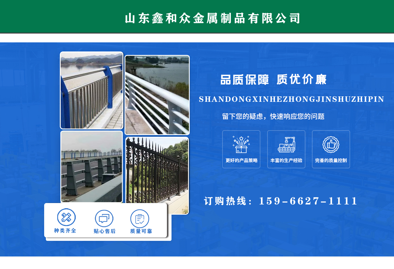 山東鑫和眾金屬制品有限公司主要產(chǎn)品有防撞護(hù)欄,橋梁護(hù)欄,道路護(hù)欄,河道護(hù)欄,不銹鋼護(hù)欄等護(hù)欄。提供設(shè)計(jì)方案,一站式定制,包您滿意價(jià)格優(yōu)惠,歡迎來電咨詢! 公司常年從事銷售護(hù)欄防撞護(hù)欄,橋梁護(hù)欄,道路護(hù)欄,河道護(hù)欄,不銹鋼護(hù)欄,橋梁鋼護(hù)欄,河道燈光護(hù)欄等。產(chǎn)品廣泛應(yīng)用于橋梁、河道、旅游景區(qū)、道路、公路、公園、小區(qū)、景觀、道路防撞等領(lǐng)域?! 」井a(chǎn)品均采用優(yōu)質(zhì)不銹鋼材料,符合相關(guān)標(biāo)準(zhǔn)。各種型號(hào)不銹鋼復(fù)合管及護(hù)欄,質(zhì)量嚴(yán)格把控。產(chǎn)品強(qiáng)度高、耐腐蝕、焊接牢固、抗沖擊、性能好,防撞護(hù)欄結(jié)構(gòu)簡(jiǎn)單、美觀實(shí)用大方?! g迎前來訂購!...